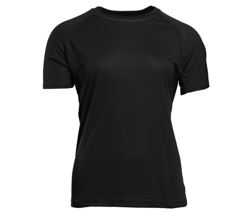 Tee-shirt femme en 100% polyester à séchage rapide. Coupe ajustée. Léger et respirant, tee-shirt adapté pour le sport. Manches raglan. Pas d'étiquette au col pour plus de confort.
