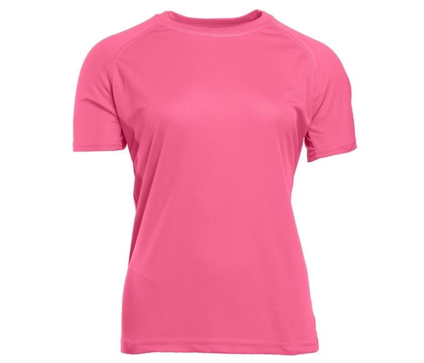 Tee-shirt femme en 100% polyester à séchage rapide. Coupe ajustée. Léger et respirant, tee-shirt adapté pour le sport. Manches raglan. Pas d'étiquette au col pour plus de confort.