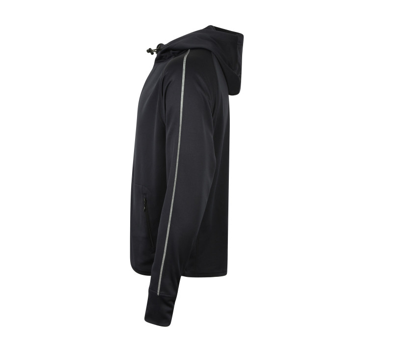 Sweat capuche avec bandes réfléchissantes. Manches raglan. Coupe près du corps. Poche intérieure MP3. 2 poches zippées latérales.