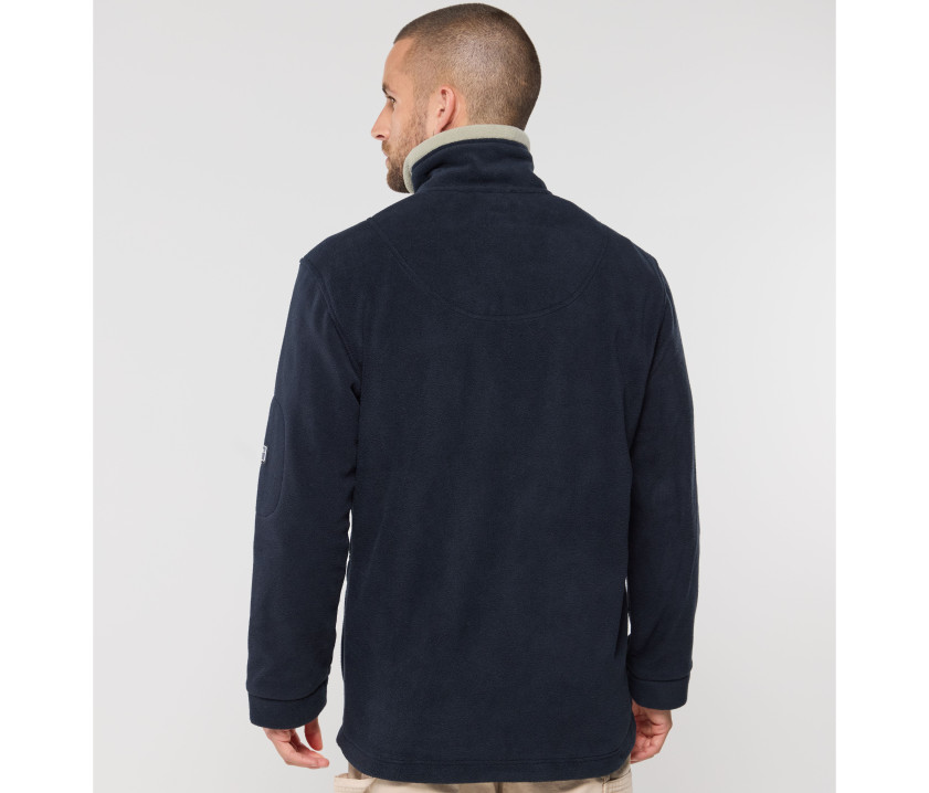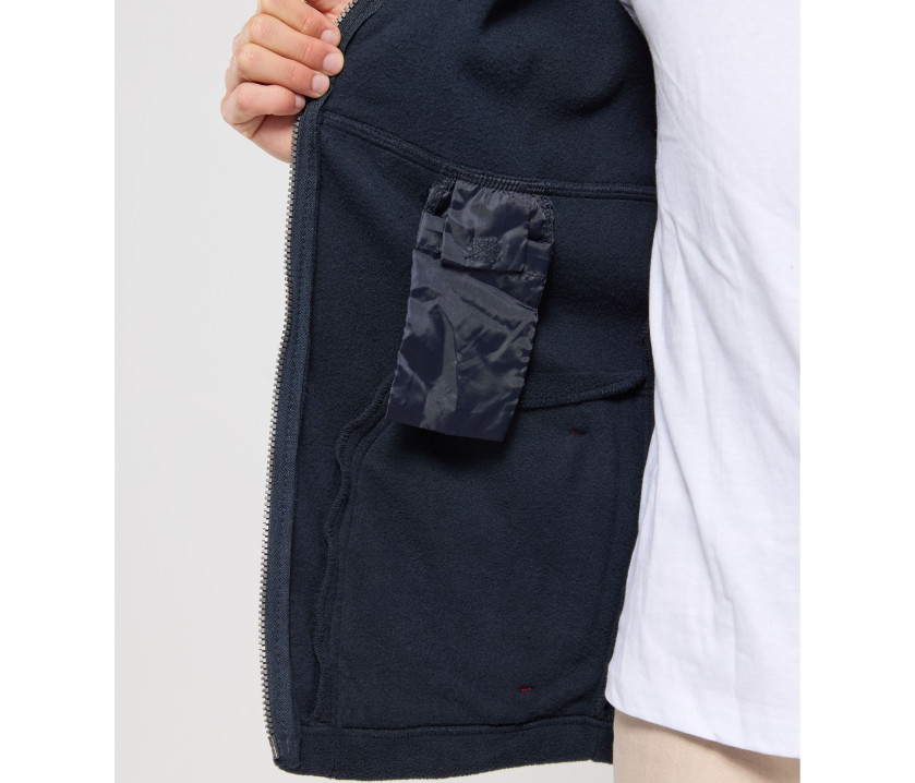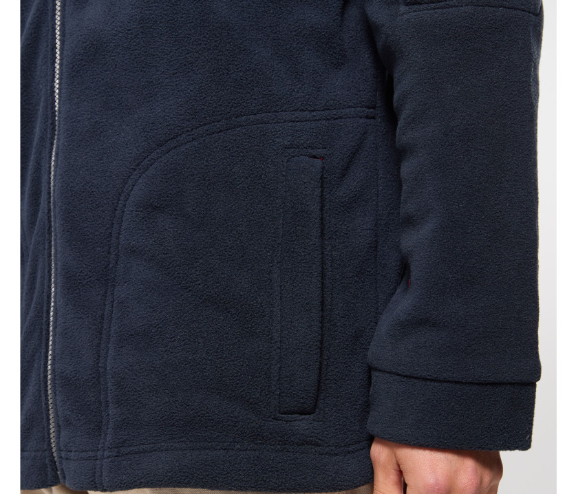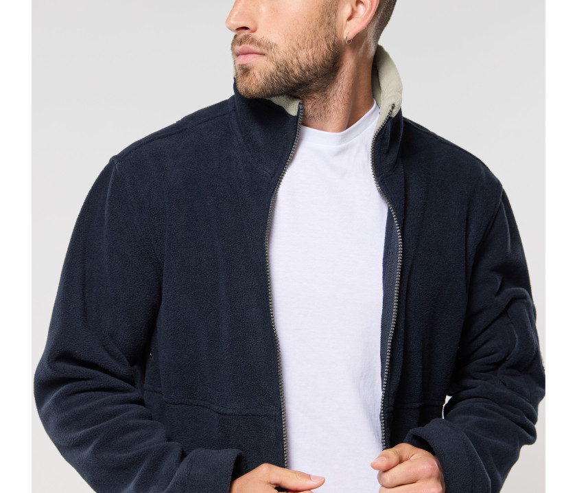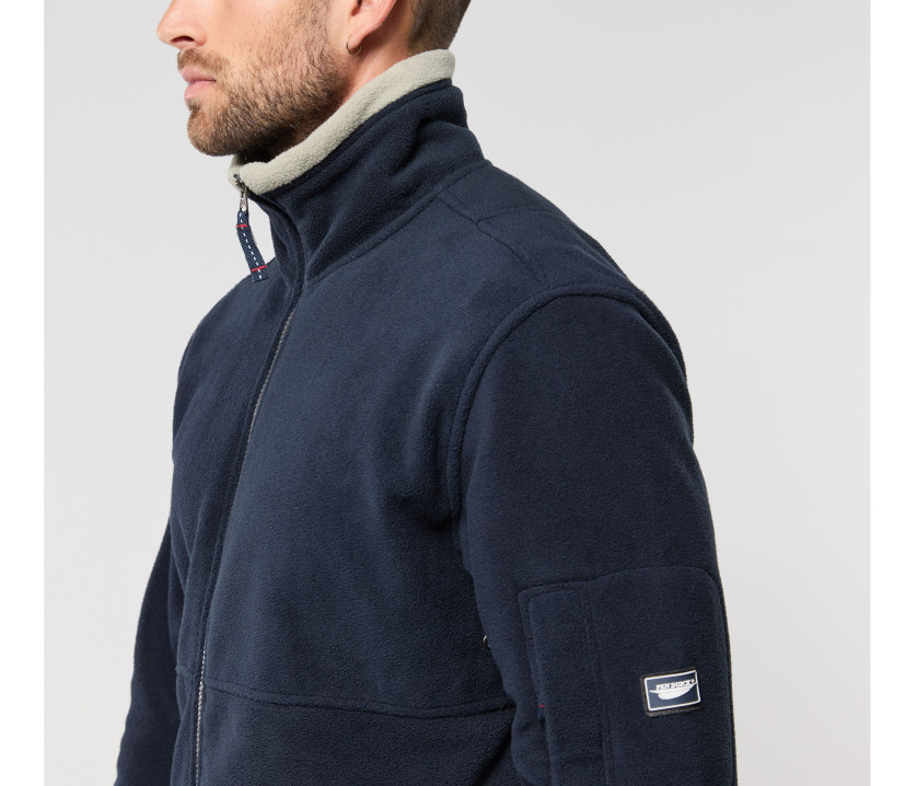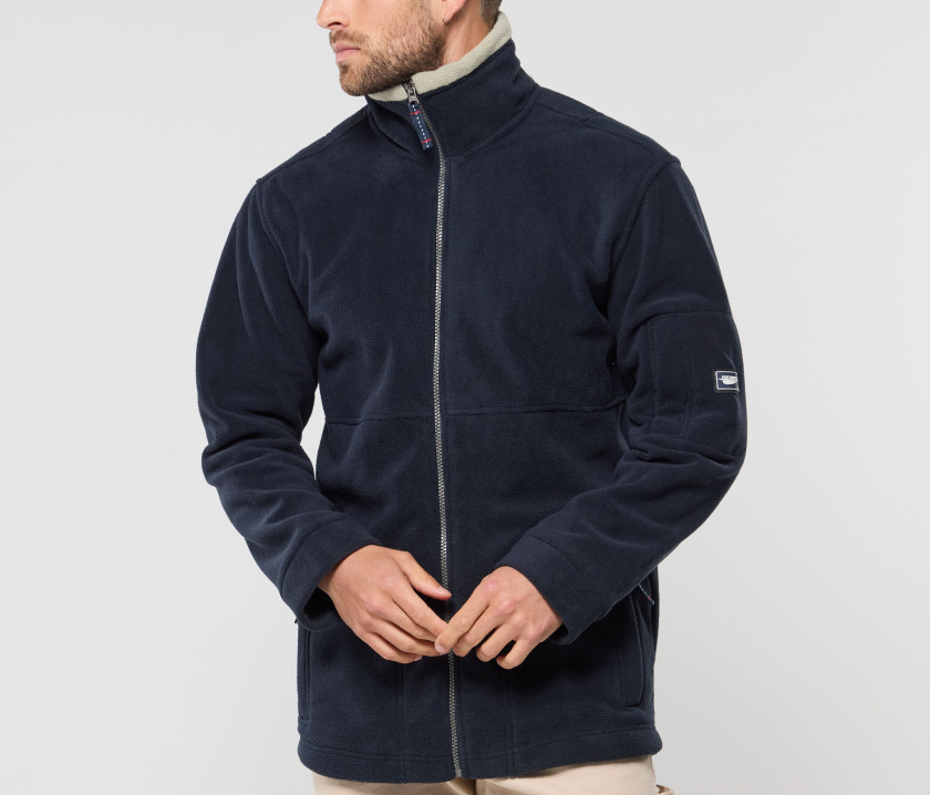 Anti-peluche. Coupe-vent. 1 poche zippée manche. 2 poches latérales zippées. Col contrasté. Oeillet d’aération. Polaire épaisse et chaude 420 g/m².