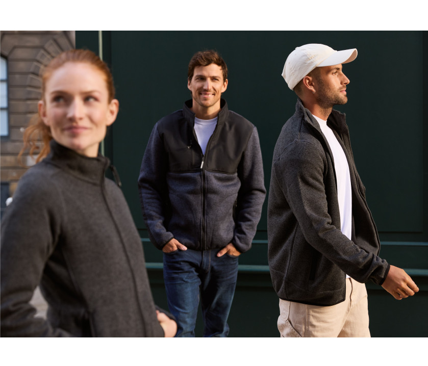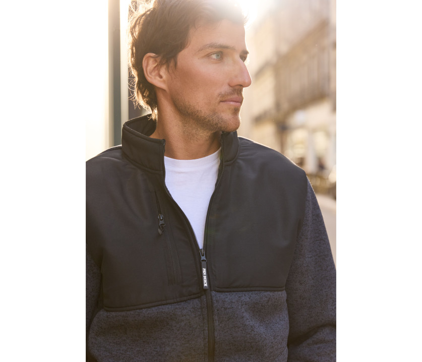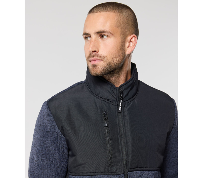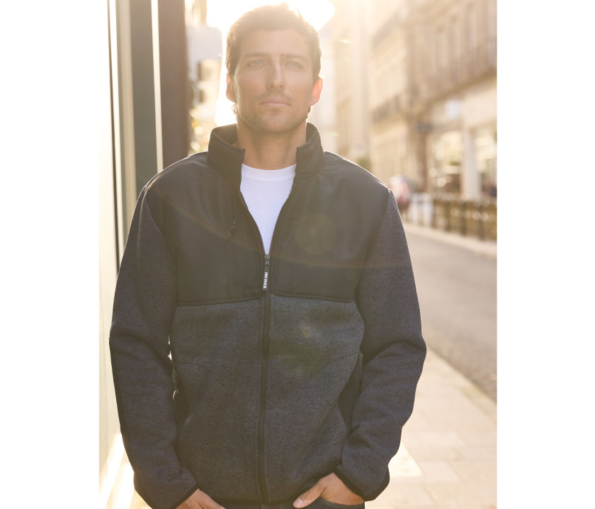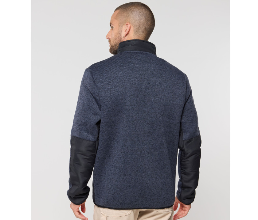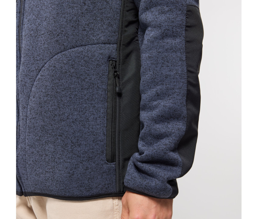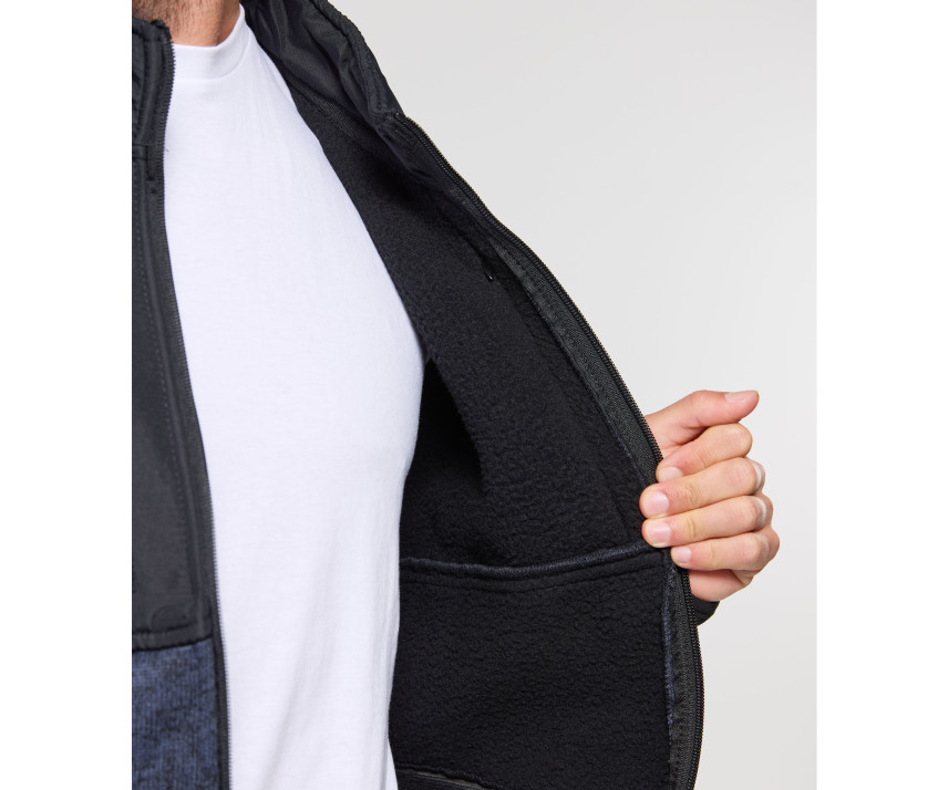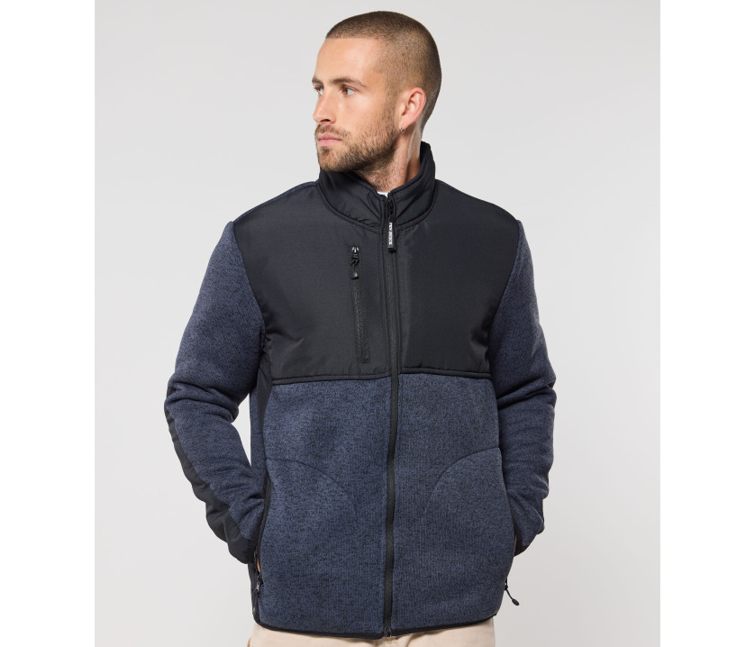 Polaire tricotée épaisse doublée sherpa. Poche poitrine zippée. 2 poches zippées latérales. Empiècements poitrine et côtés, renforts aux coudes, en polyester 300D.