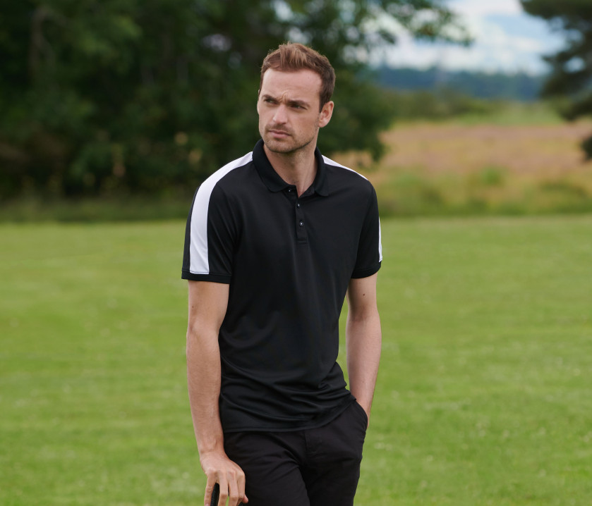 Matière stretch avec technologie anti-humidité. Coupe ajustée. Bandes contrastées épaules et manches. Col et emmanchures en bords côte. Manches droites. Plaquette 3 boutons ton sur ton et coutures contrastées. Étiquette détachable.