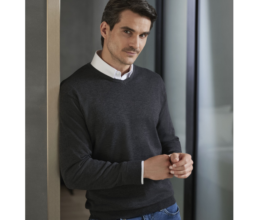 Col V. Manches droites. Poignets, col et bas en côte 1x1 en Lycra®. Lavable à 40°C.