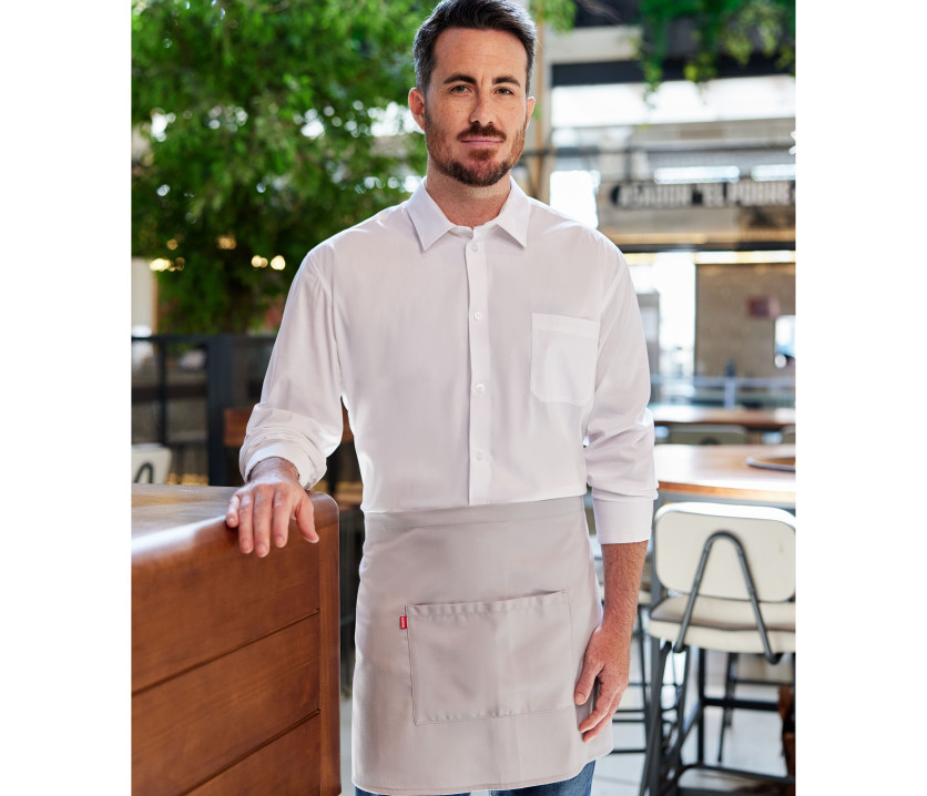 Deux bandes aux extrémités pour serrer le tablier. 1 poche centrale.